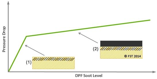 Jaunā vai tīrā kvēpu filtra virsma tiek pakļauta izplūdes gāzu plūsmai, un kvēpi ātri uzkrājas virsmas porās. Lai arī tikai neliela daļa no visiem sodrējiem uzkrājas filtra mikroporās, tas veicina strauju filtra spiediena krituma palielināšanos, kā parādīts 2. attēlā . Turpmākā kvēpu uzkrāšanās veido slāni (kūkas kārtu) gar kanāla sienām, kā rezultātā lēnāk un pakāpeniski palielinās filtra spiediena kritums. Atkarībā no kvēpu piepildīšanas līmeņa un filtra veida poru uzkrāšanās dažos gadījumos var radīt 50% vai vairāk no filtra spiediena krituma. Kvēpu filtra nelineārā reakcija uz materiāla uzkrāšanos sarežģī filtra kvēpu vai pelnu noslogojuma līmeņa noteikšanu, pamatojoties tikai uz spiediena kritumu.