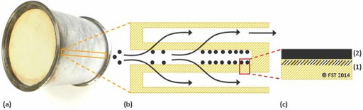 1. attēls. Dīzeļdegvielas kvēpu filtrs lieljaudas transportlīdzekļiem (a). Šķērsgriezuma attēlojums, kurā parādīti filtrēšanas procesi vairākos kvēpu filtra kanālos (b). Daļiņu uztveršanas un uzkrāšanās tuvplāna skats kanāla sienās (c).
